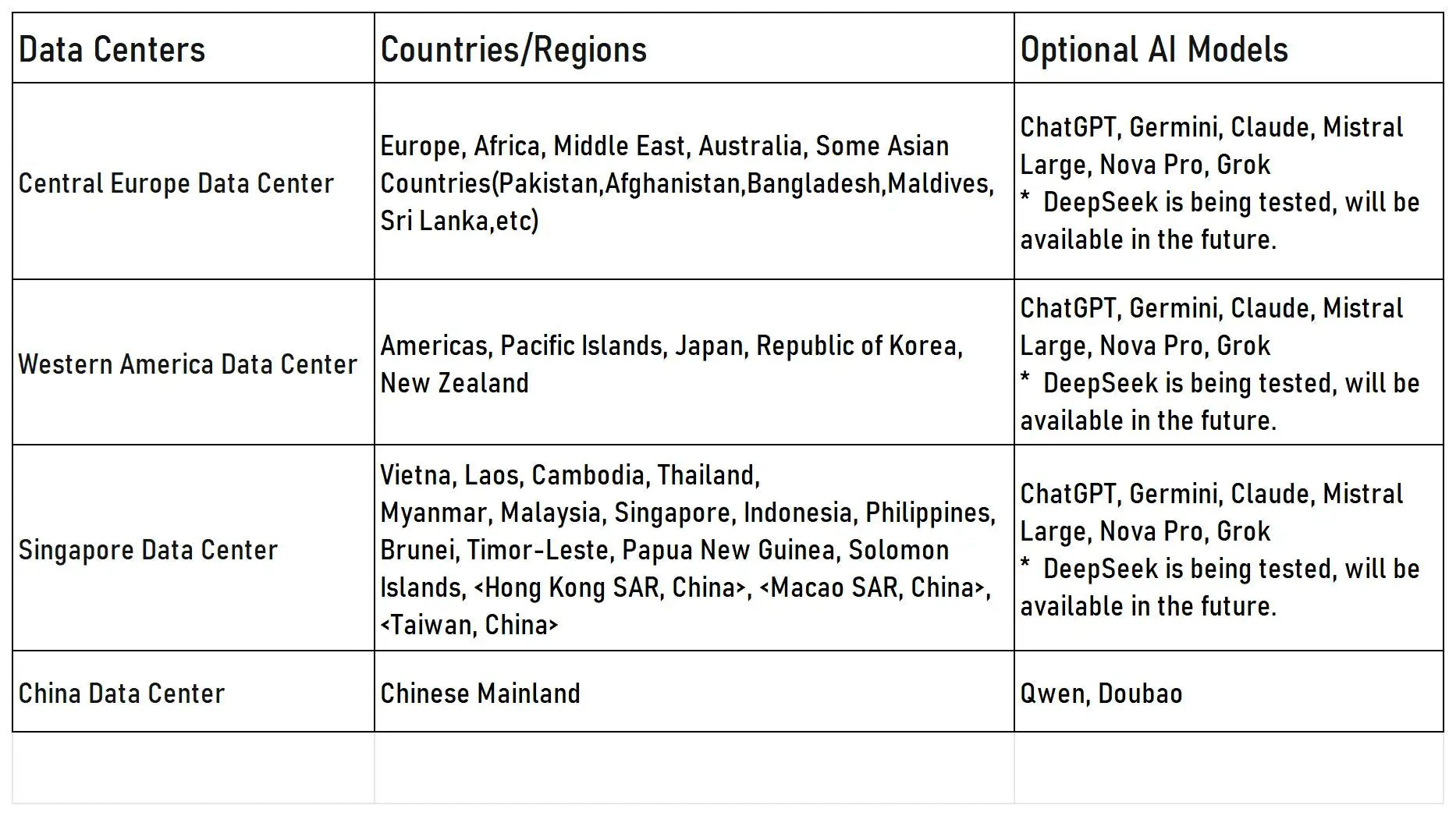 ● Built-in multiple AI large language models, including ChatGPT, Germini, Claude, Mistral Large, Nova Pro, Grok, Qwen, Doubao, Deepseek, etc. The optional AI models may be different in different countries/regions.