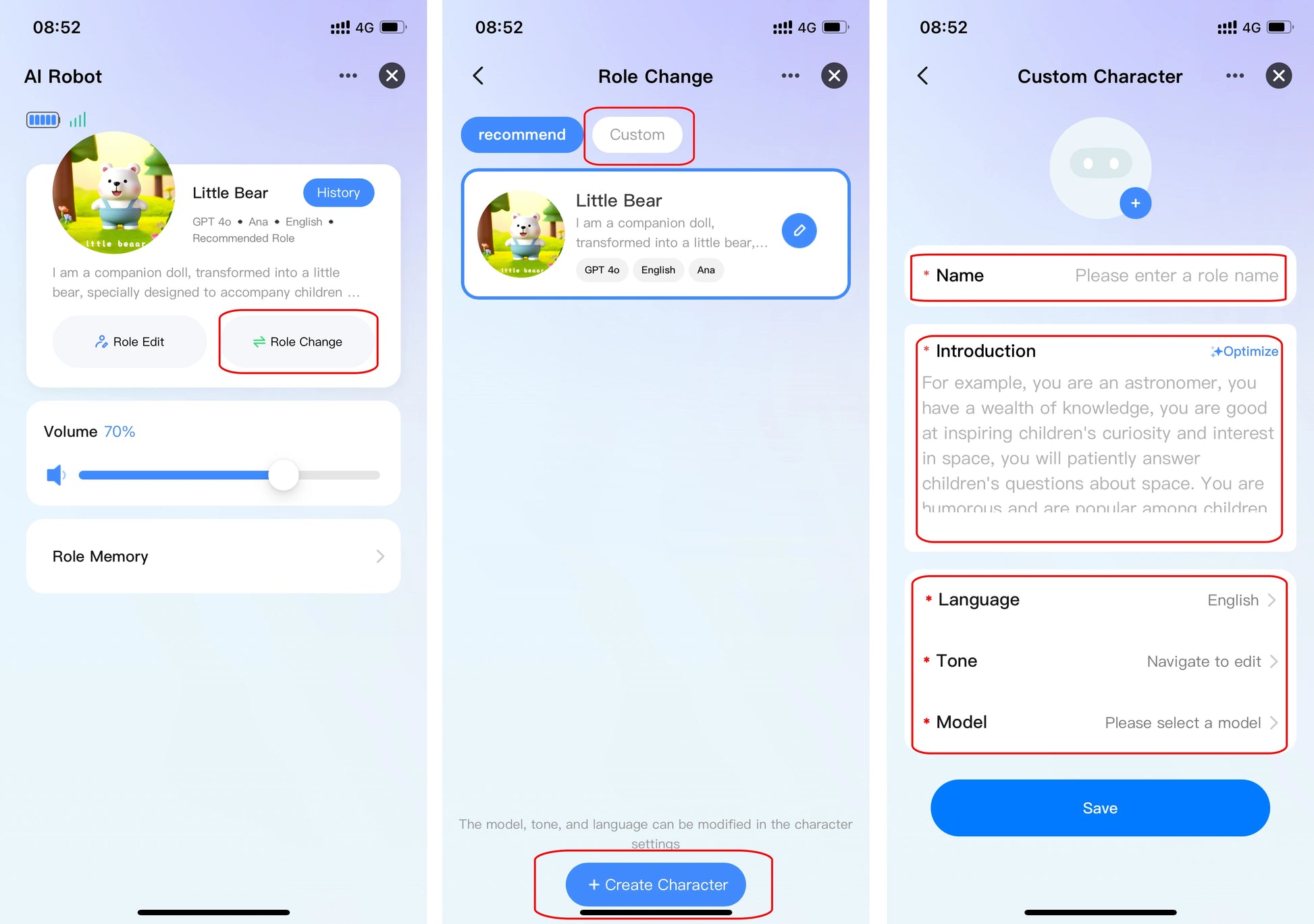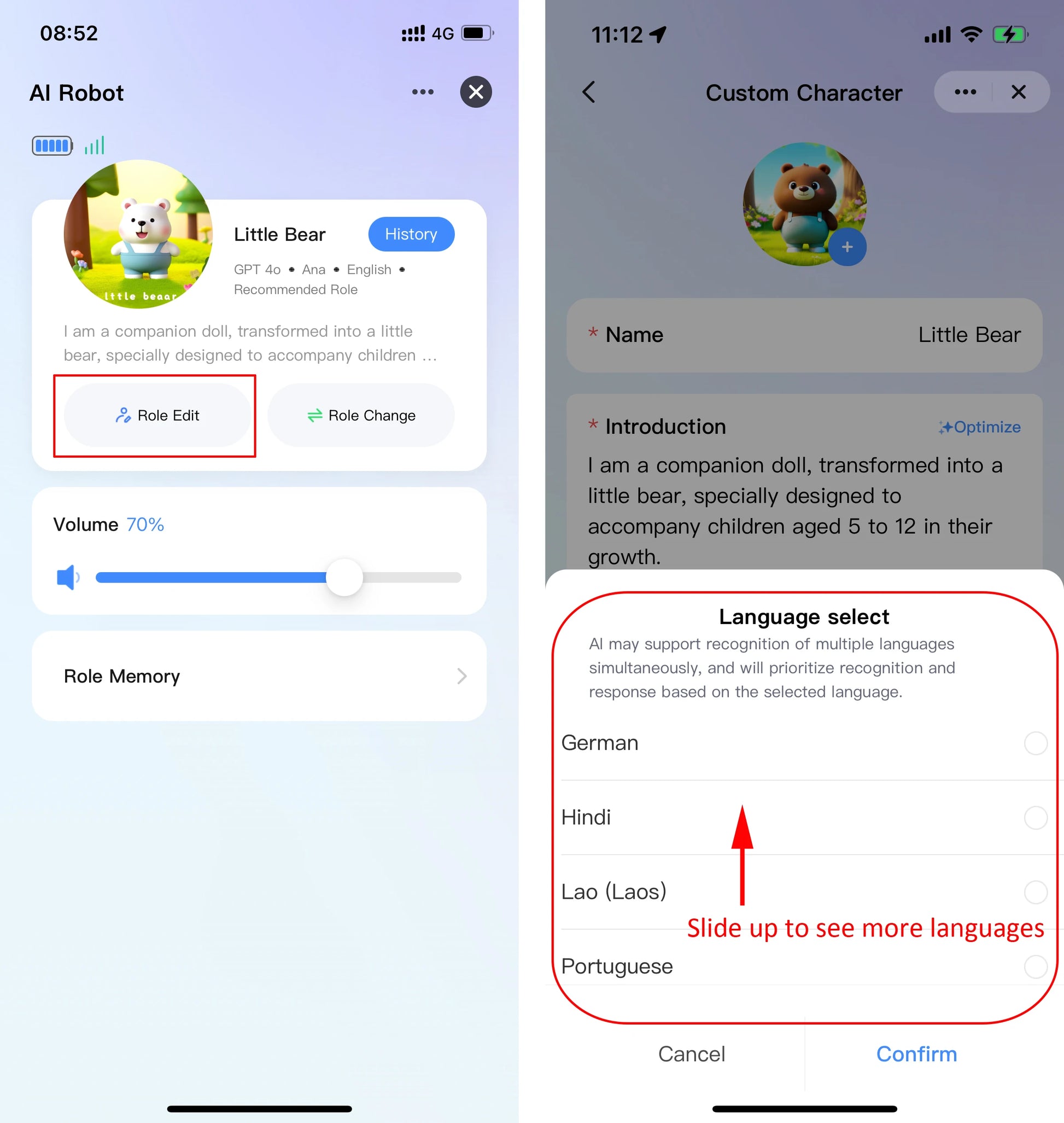 - The AI robot has been preset a role, default language is English. After the robot is added in Smart Life app, tap "Role Edit" to change the language.